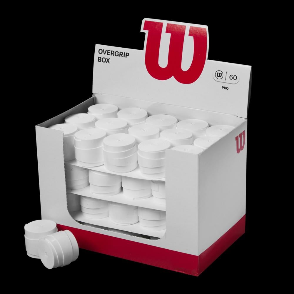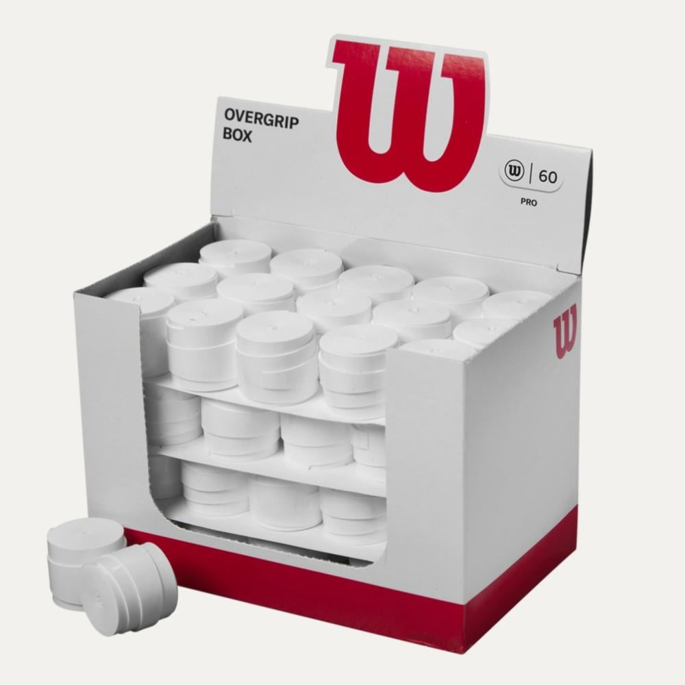 Get a more confident grip on your game with Wilson's Pro Overgrip. The choice of many professionals, the grip is ultra-thin and stretchy, and the tapered shape makes it easy to put on. The tackiness also makes it easier to hold the racket even when your hands get sweaty from playing. Includes 60 white overgrips in a more sustainable cardboard box, and each grip comes with a thin strip of tape that's easy to apply after wrapping the grip around the handle.